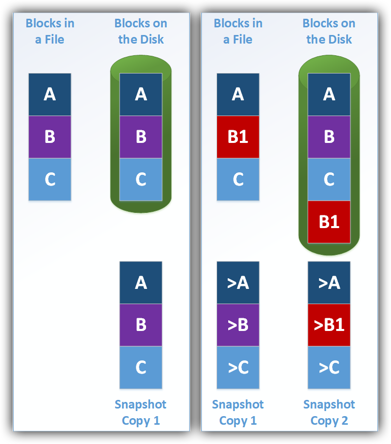 Snapshots record only the block-level changes since the last snapshot.